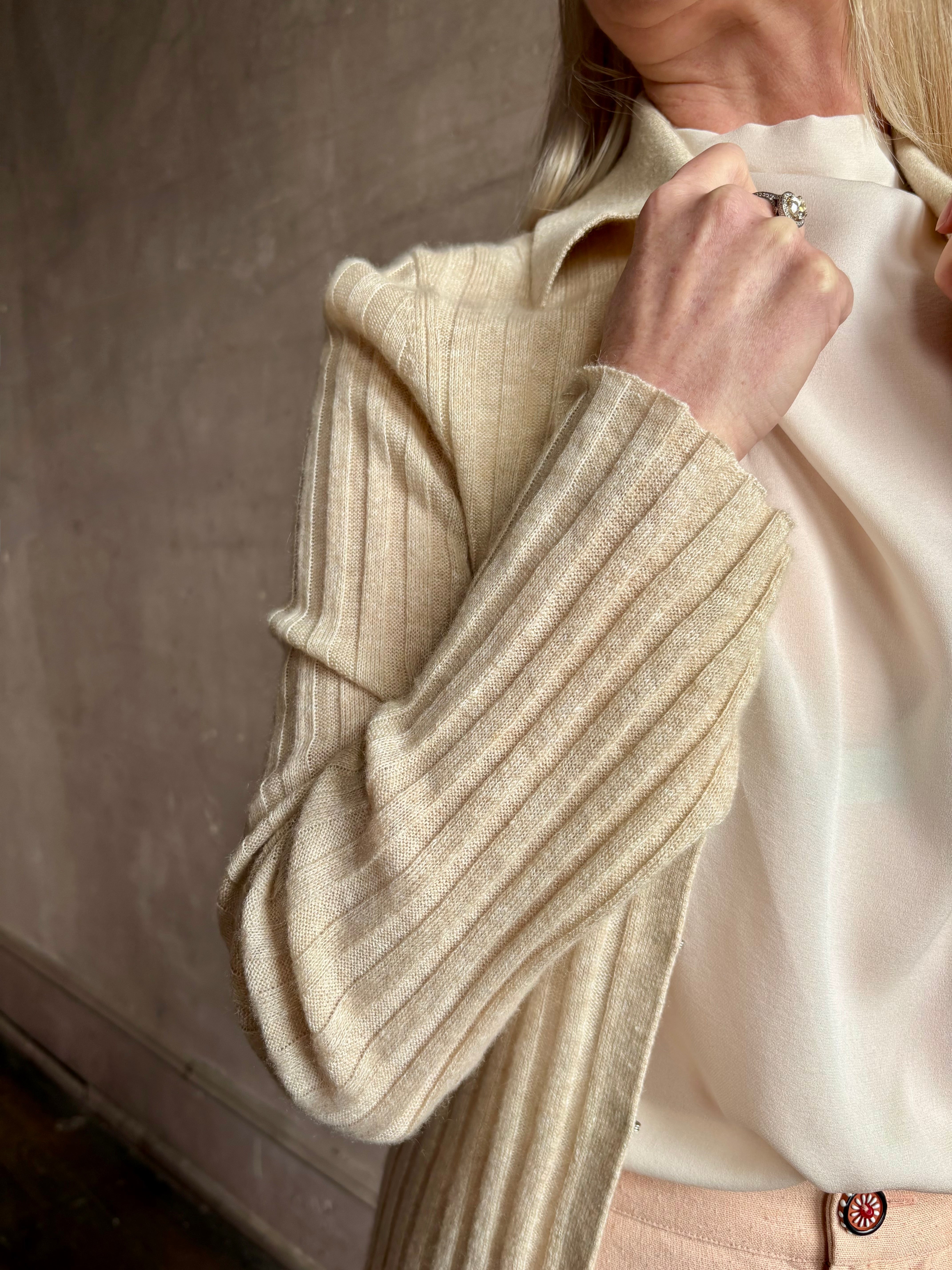 The Breezy Cardigan showcases exceptional material composition with 58% cashmere providing luxurious softness and natural insulation, enhanced by 42% linen adding breathability, natural texture, and lightweight sophistication. This innovative blend creates year-round versatility with temperature-regulating properties while the expert construction ensures refined proportions and comfortable drape that elevates this beyond typical cardigans.