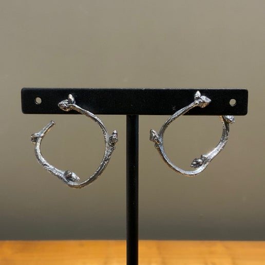 Cast from wild blueberry branches with sterling silver. Oxidized finish. Post back.